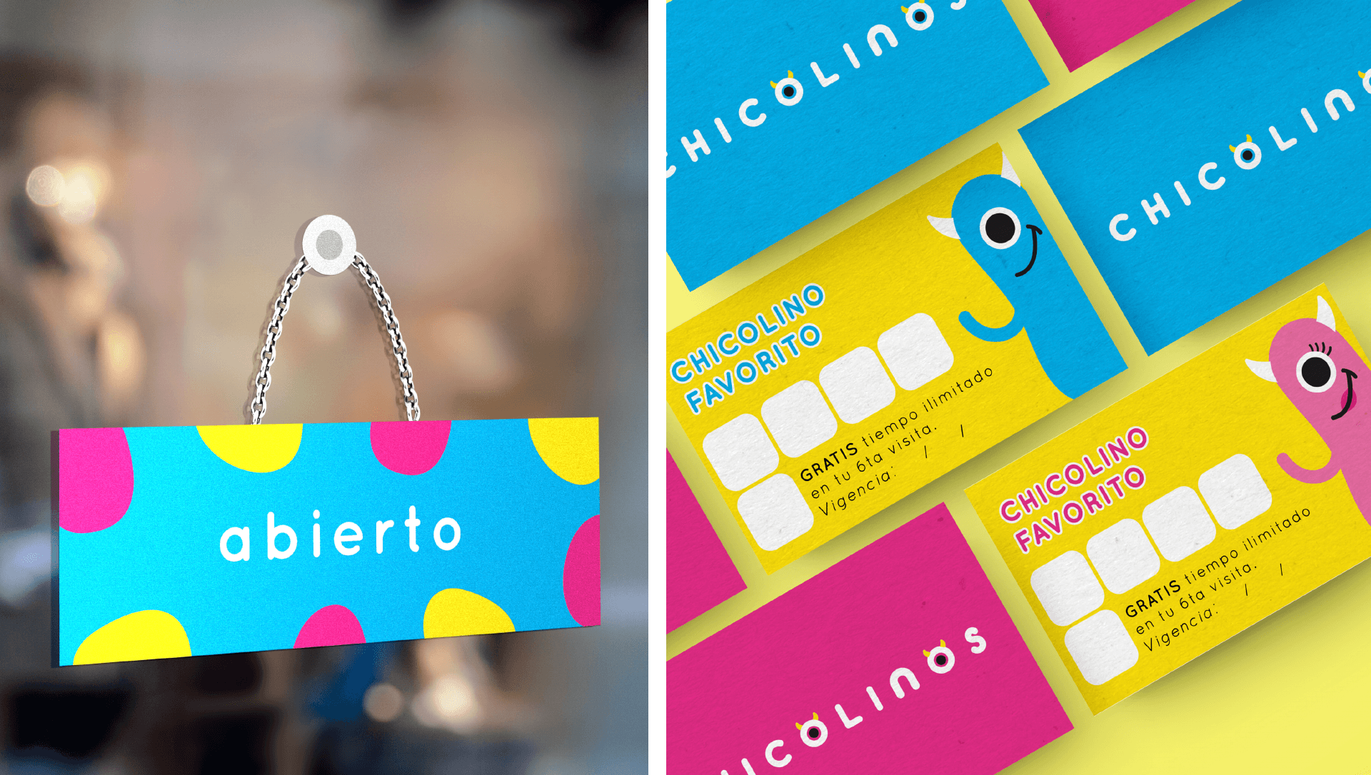 Por otro lado, los íconos que complementan la tipografía son unos cuernos y unos círculos en las letras “o”, cuyo fin es simular unos unos monstruos (personajes de la identidad) y de esta manera darle vida a la palabra. Creamos el mundo de “chicoleaos”.