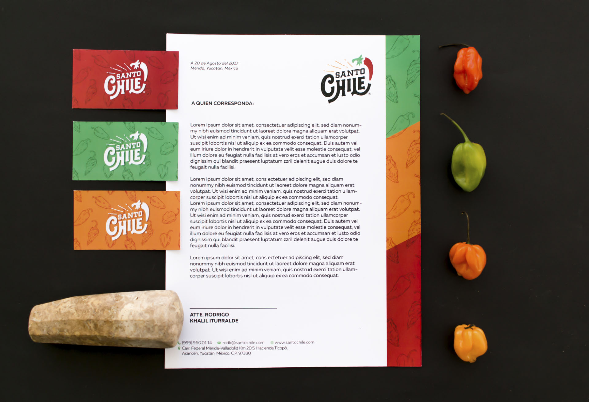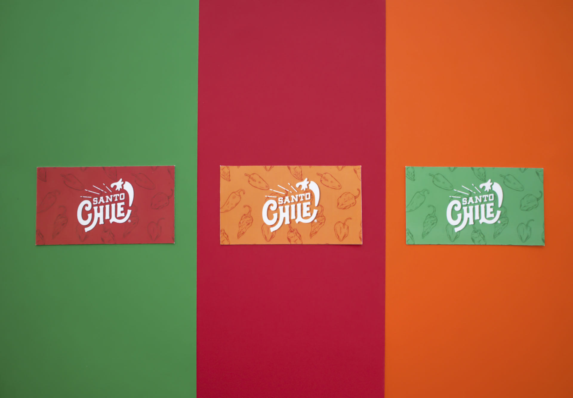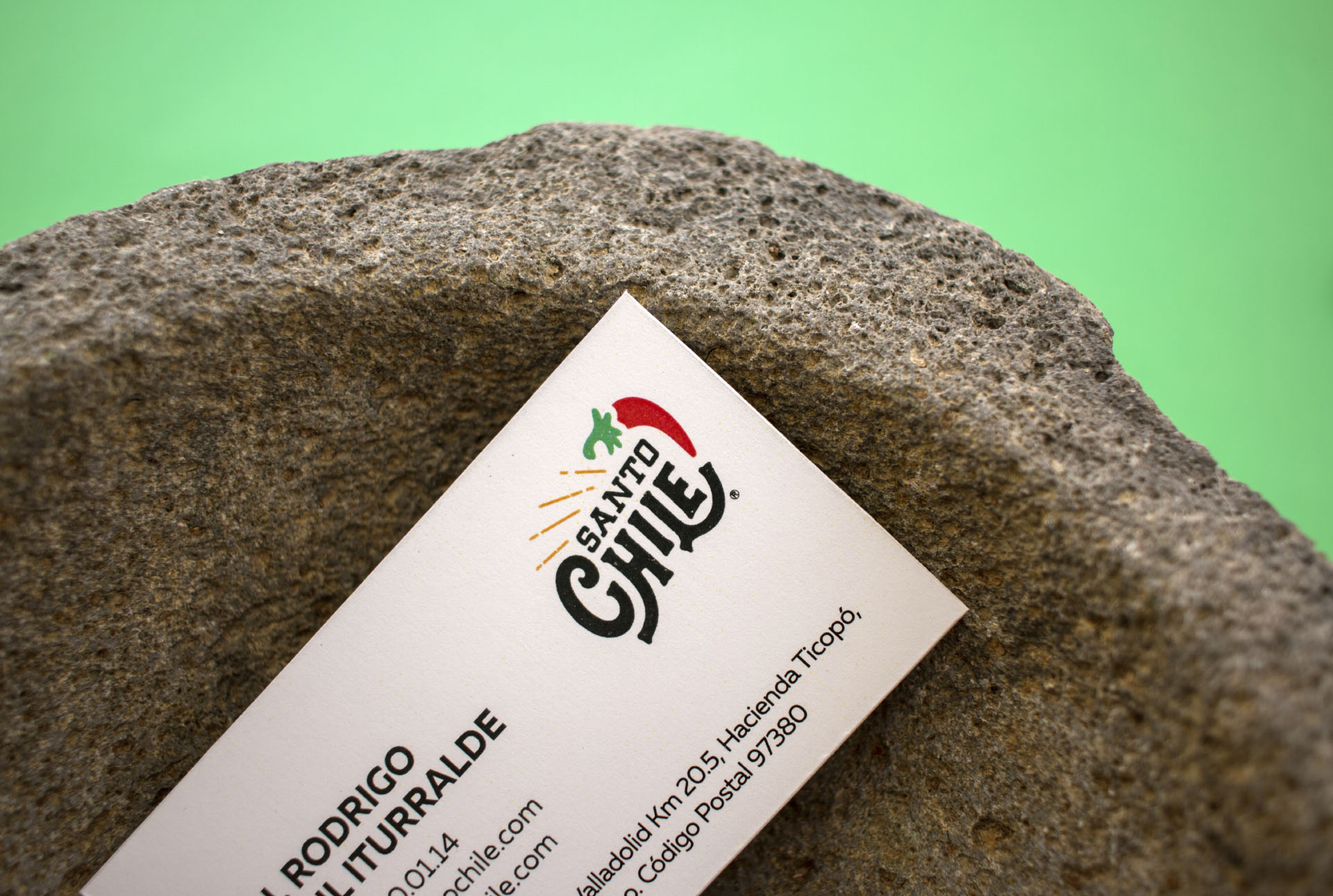Para el isologo se diseñó una tipografía dinámica con un acabado que asemeja el grabado tradicional. Como distintivos y apoyo visual se crearon dos elementos gráficos que refuerzan el significado de la marca: “Los destellos de luz” que representan la parte santidad y “El chile”, que es el producto al que le queremos dar valor agregado.